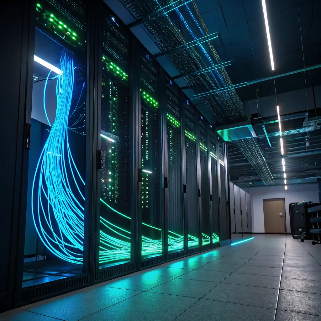 A high-tech data center with fiber optic cables and cloud infrastructure, representing CELINTECH's digital solutions.